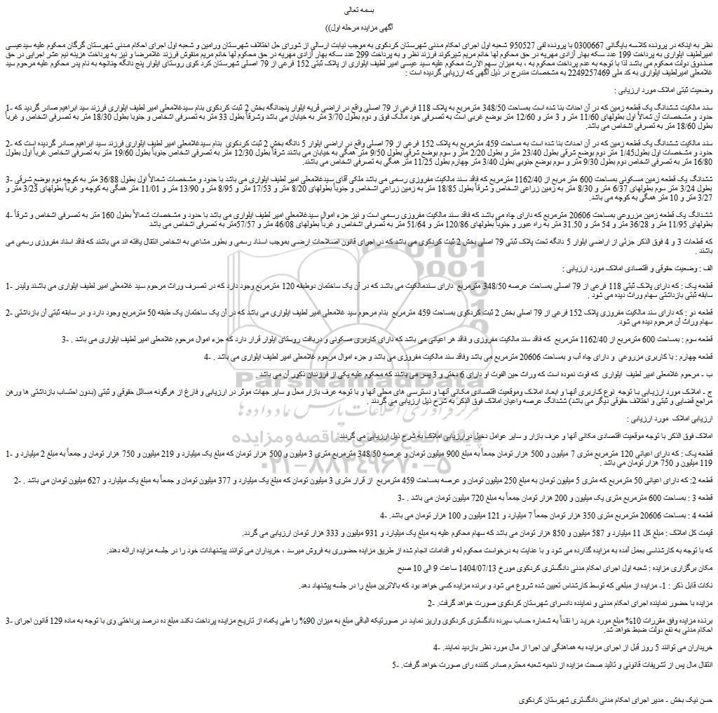 نظر به اینکه در پرونده کلاسه بایگانی 0300667 با پرونده لفی 950527 شعبه اول اجرای احکام مدنی شهرستان کردکوی به موجب نیابت ارسالی از شورای حل اختلاف شهرستان ورامین و شعبه اول اجرای احکام مدنی شهرستان گرگان محکوم علیه سیدعیسی امیرلطیف ایلواری به پرداخت 199 عدد سکه بهار آزادی مهریه در حق محکوم لها خانم مریم شیرکوند فرزند نظر و به پرداخت 299 عدد سکه بهار آزادی مهریه در حق محکوم لها خانم مریم منقوش فرزند غلامرضا و نیز به پرداخت هزینه نیم عشر اجرایی در حق صندوق دولت محکوم می باشد لذا با توجه به عدم پرداخت محکوم به ، به میزان سهم الارث محکوم علیه سید عیسی امیر لطیف ایلواری از پلاک ثبتی 152 فرعی از 79 اصلی شهرستان کرد کوی روستای ایلوار پنج دانگه چنانچه به نام پدر محکوم علیه مرحوم سید غلامعلی امیرلطیف ایلواری به کد ملی 2249257469 به مشخصات مندرج در ذیل آگهی که ارزیابی گردیده است :