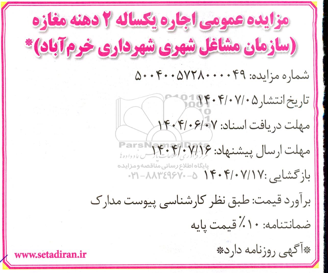 مزایده عمومی اجاره یکساله 2 دهنه مغازه (سازمان مشاغل شهری شهرداری خرم آباد)