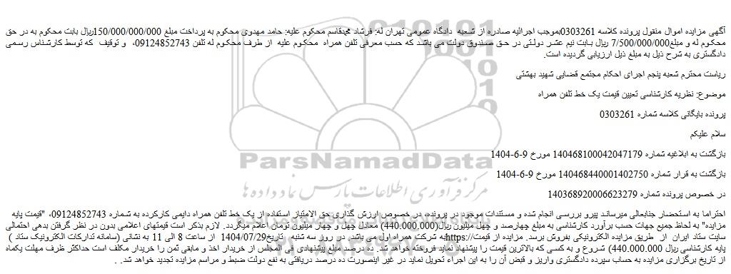 احتراما به استحضار جنابعالی میرساند پیرو بررسی انجام شده و مستندات موجود در پرونده، در خصوص ارزش گذاری حق الامتیاز استفاده از یک خط تلفن همراه دایمی کارکرده به شماره 09124852743، "قیمت پایه مزایده" به لحاظ جمیع جهات حسب برآورد کارشناسی به مبلغ چهارصد و چهل میلیون ریال(440.000.000) معادل چهل و چهار میلیون تومان اعلام میگردد. لازم بذکر است قیمتهای اعلامی بدون در نظر گرفتن بدهی احتمالی به شرکت همراه اول می باشد. در روز سه شنبه تاریخ1404/07/29 از ساعت 8 الی 11 به نشانی (سامانه تدارکات الکترونیک ستاد ) سایت ستاد ایران از طریق مزایده الکترونیکی بفروش برسد. مزایده از قیمت پایه کارشناسی ریال 440.000.000) شروع و به کسی که بالاترین قیمت را پیشنهاد نماید فروخته خواهد شد. ده درصد مبلغ پیشنهادی فی المجلس از خریدار اخذ و مابقی ثمن را خریدار مکلف است حداکثر ظرف مهلت یکماه از تاریخ برگزاری مزایده به حساب سپرده دادگستری واریز و قبض آن را به این اجراء تحویل نماید در غیر اینصورت ده درصد دریافتی به نفع دولت ضبط و مراسم مزایده تجدید خواهد شد. .