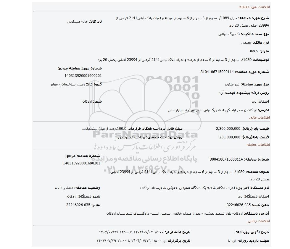 | عنوان معامله: 1089/. سهم از 3 سهم از 6 سهم از عرصه و اعیان پلاک ثبتی2141 فرعی از 23994 اصلی یخش 20 یزد | ||