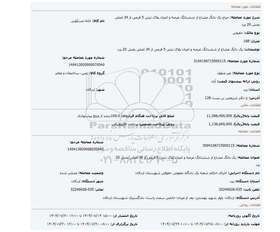 | شرح مورد معامله: حراج یک دانگ مشاع از ششدانگ عرصه و اعیان پلاک ثبتی 5 فرعی از 34 اصلی بخش 20 یزد | نام کالا: خانه مسکونی | |