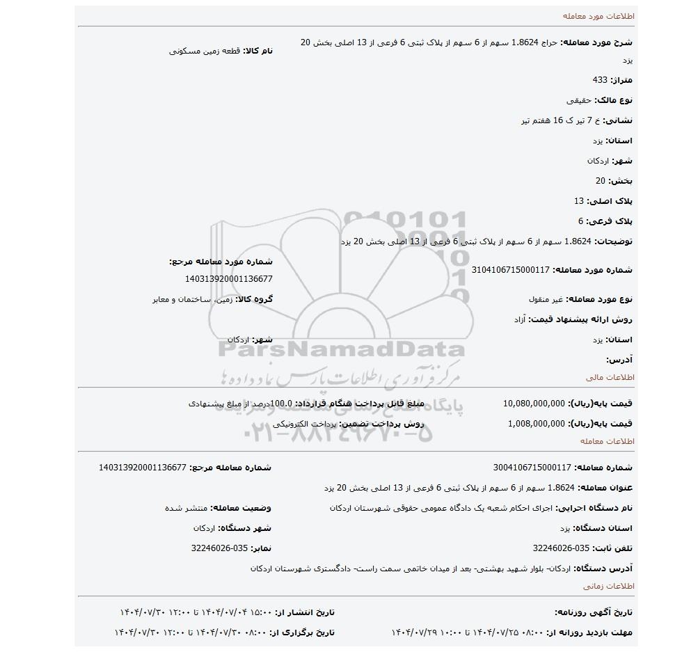 | شرح مورد معامله: حراج 1.8624 سهم از 6 سهم از پلاک ثبتی 6 فرعی از 13 اصلی بخش 20 یزد | نام کالا: قطعه زمین مسکونی | |