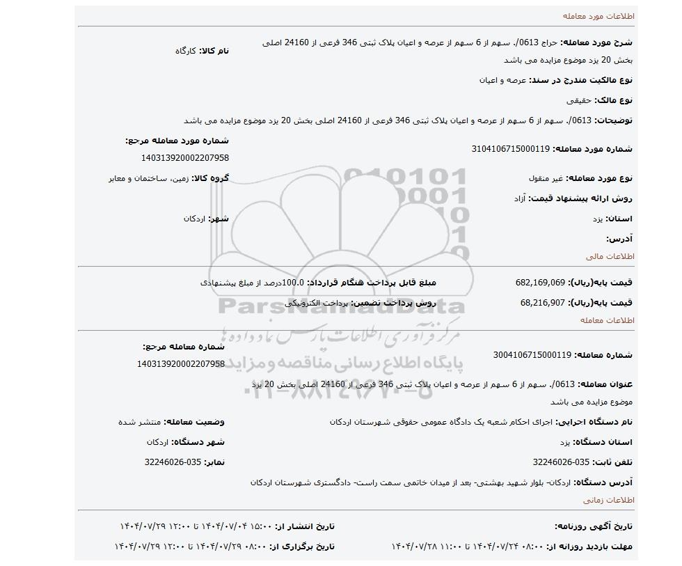 | عنوان معامله: 0613/. سهم از 6 سهم از عرصه و اعیان پلاک ثبتی 346 فرعی از 24160 اصلی بخش 20 یزد موضوع مزایده می باشد | ||