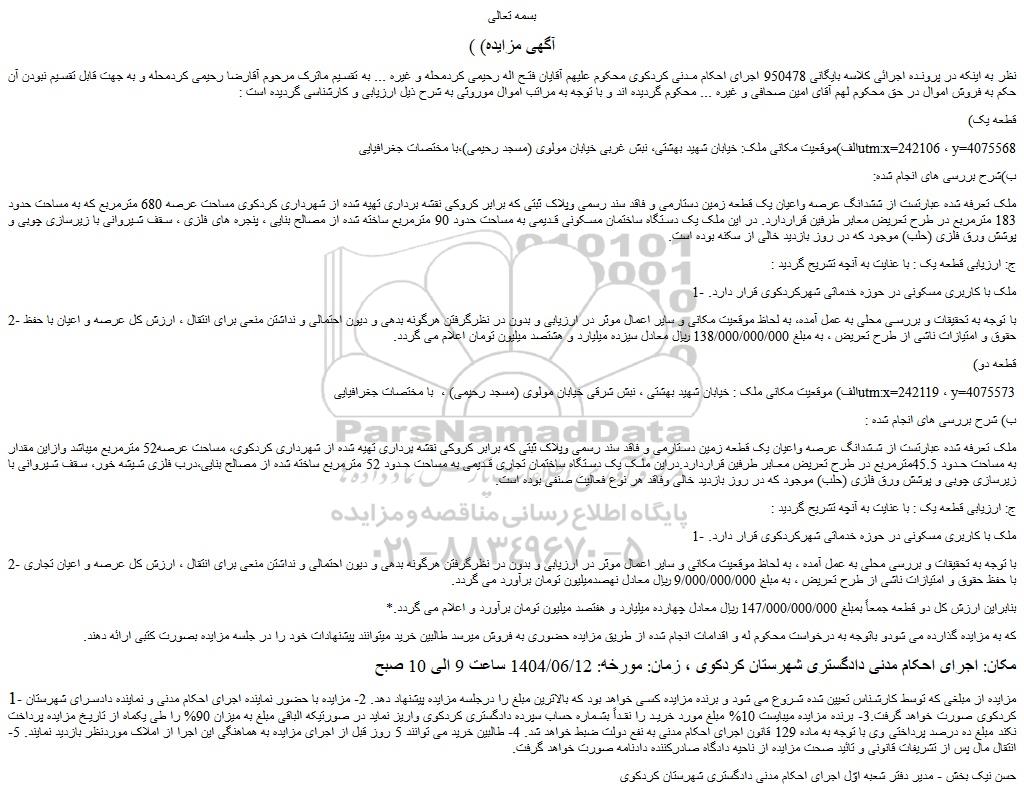 *بنابراین ارزش کل دو قطعه جمعاً بمبلغ 147/000/000/000 ریال معادل چهارده میلیارد و هفتصد میلیون تومان برآورد و اعلام می گردد.