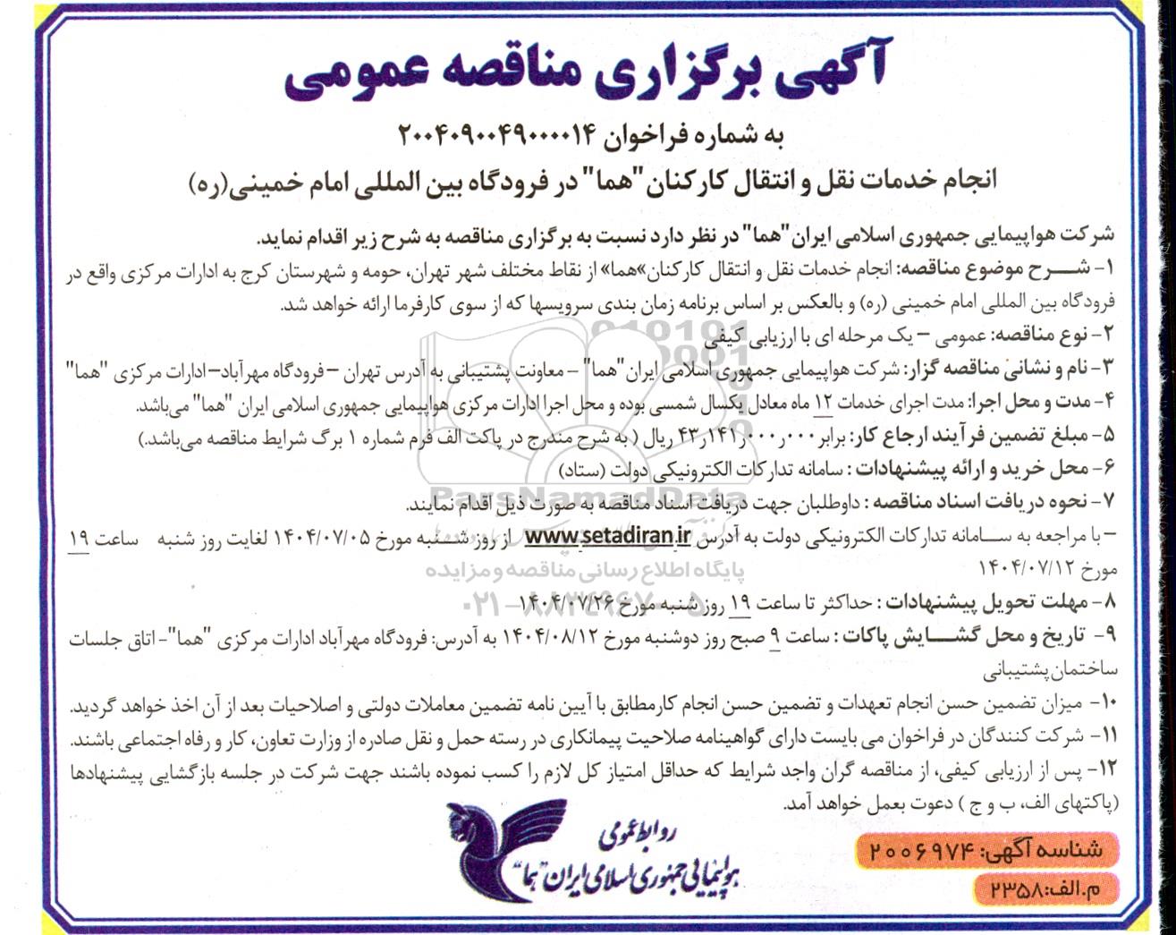 شرکت هواپیمایی جمهوری اسلامی ایران "هما" در نظر دارد نسبت به برگزاری مناقصه به شرح زیر اقدام نماید: