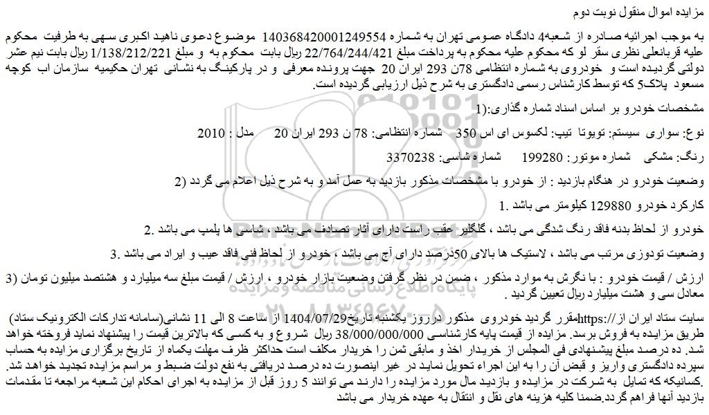 به موجب اجرائیه صادره از شعبه4 دادگاه عمومی تهران به شماره 140368420001249554 موضوع دعوی ناهید اکبری سهی به طرفیت محکوم علیه قربانعلی نظری سقر لو که محکوم علیه محکوم به پرداخت مبلغ 22/764/244/421 ریال بابت محکوم به و مبلغ 1/138/212/221 ریال بابت نیم عشر دولتی گردیده است و خودروی به شماره انتظامی 78ن 293 ایران 20 جهت پرونده معرفی و در پارکینگ به نشانی تهران حکیمیه سازمان اب کوچه مسعود پلاک5 که توسط کارشناس رسمی دادگستری به شرح ذیل ارزیابی گردیده است.