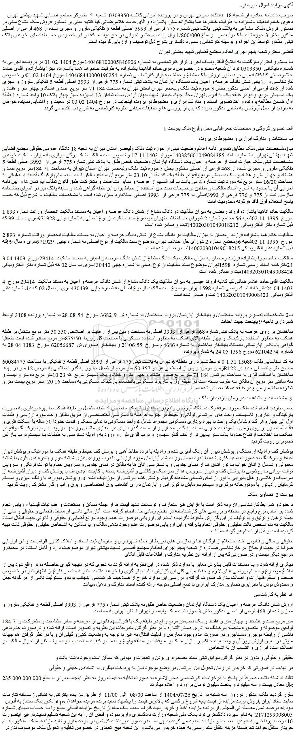 بموجب دادنامه صادره از شعبه 18  دادگاه عمومی تهران و در پرونده اجرایی کلاسه 0303350  شعبه  5  متمرکز مجتمع قضایی شهید بهشتی تهران  دعوی خانم آناهیتا پاشازاده به طرفیت خانم ها هما پاشازاده میترا پاشازاده و آقای حامد غلامرضائی کیا کلایه مبنی بر دستور فروش ملک مشاع مبنی بر دستور فروش ملک مشاعی به پلاک ثبتی  پلاک ثبتی شماره 775 فرعی از 3993 اصلی قطعه 5 تفکیکی مفروز و مجزی شده از 468 فرعی از اصلی مذکور بخش 3 حوزه ثبت ملک ولیعصر   و مبلغ 1/800/000 ریال بابت نیم عشر اجرایی در حق دولت،  که در این خصوص حسب تقاضای  خواهان پلاک ثبتی  مذکور توسط این اجراء و بوسیله کارشناس رسمی دادگستری بشرح ذیل توصیف و ارزیابی گردیده است.
