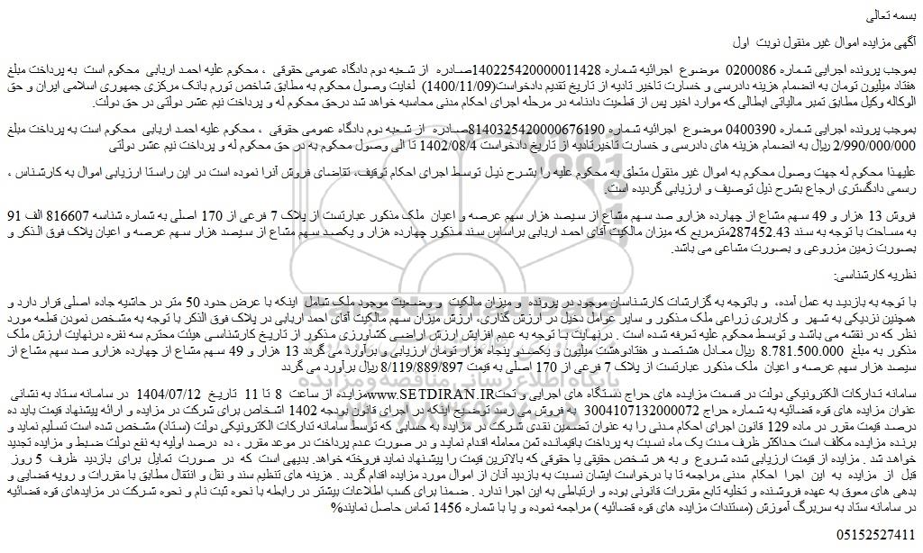 مزایده از ساعت  8 تا 11  تاریخ  1404/07/12  در سامانه ستاد به نشانی سایت ستاد ایران  سامانه تدارکات الکترونیکی دولت در قسمت مزایده های حراج دستگاه های اجرایی و تحت عنوان مزایده های قوه قضائیه به شماره حراج 3004107132000072  به فروش می رسد توضیح اینکه در اجرای قانون بودجه 1402 اشخاص برای شرکت در مزایده و ارائه پیشنهاد قیمت باید ده درصد قیمت مقرر در ماده 129 قانون اجرای احکام مدنی را به عنوان تضمین نقدی شرکت در مزایده به حسابی که توسط سامانه تدارکات الکترونیکی دولت (ستاد) مشخص شده است تسلیم نماید و برنده مزایده مکلف است حداکثر ظرف مدت یک ماه نسبت به پرداخت باقیمانده ثمن معامله اقدام نماید و در صورت عدم پرداخت در موعد مقرر ، ده  درصد اولیه به نفع دولت ضبط و مزایده تجدید خواهد شد . مزایده از قیمت ارزیابی شده شروع  و به هر شخص حقیقی یا حقوقی که بالاترین قیمت را پیشنهاد نماید فروخته خواهد. بدیهی است  که  در  صورت  تمایل  برای  بازدید  ظرف  5 روز  قبل  از  مزایده  به  این  اجرا  احکام  مدنی مراجعه تا با درخواست ایشان نسبت به بازدید آنان از اموال مورد مزایده اقدام گردد . هزینه های تنظیم سند و نقل و انتقال مطابق با مقررات و رویه قضایی و بدهی های معوق به عهده فروشنده و تخلیه تابع مقررات قانونی بوده و ارتباطی به این اجرا ندارد . ضمنا برای کسب اطلاعات بیشتر در رابطه با نحوه ثبت نام و نحوه شرکت در مزایدهای قوه قضائیه در سامانه ستاد به سربرگ آموزش (مستندات مزایده های قوه قضائیه ) مراجعه نموده و یا با شماره 1456 تماس حاصل نمایند%