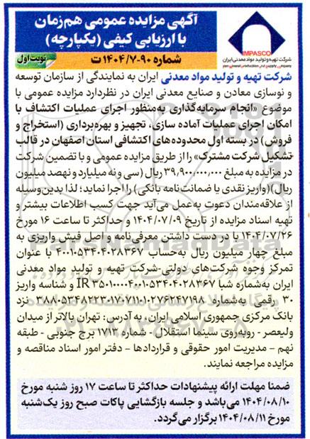 شرکت تهیه و تولید مواد معدنی ایران به نمایندگی از سازمان توسعه و نوسازی معادن و صنایع معدنی ایران در نظر دارد مزایده عمومی با موضوع «انجام سرمایه گذاری به منظور اجرای عملیات اکتشاف با امکان اجرای عملیات آماده سازی، تجهیز و بهره برداری (استخراج و فروش) در بسته اول محدودههای اکتشافی استان اصفهان در قالب تشکیل شرکت مشترک» را از طریق مزایده عمومی و با تضمین شرکت در مزایده به مبلغ 39.900.000.000 ریال (سی و نه میلیارد و نهصد میلیون) ریال واریز نقدی یا ضمانت نامه بانکی را اجرا نماید؛ لذا بدین وسیله از علاقه مندان دعوت به عمل میآید جهت کسب اطلاعات بیشتر و تهیه اسناد مزایده از تاریخ 1404.07.09 و حداکثر تا ساعت 16 مورخ 1404.07.26 با در دست داشتن معرفی نامه و اصل فیش واریزی به مبلغ چهار میلیون ریال به حساب 4001053404028367 با عنوان تمركز وجوه شرکتهای دولتی شرکت تهیه و تولید مواد معدنی ایران به شماره شبا 350100004001053404028367 IR و شناسه واریز 30 رقمی به شماره 388053482230170711010276247198 نزد بانک مرکزی جمهوری اسلامی ایران به آدرس تهران بالاتر از میدان وليعصر - روبه روی سینما استقلال - شماره 1713 برج جنوبی - طبقه نهم - مدیریت امور حقوقی و قراردادها - دفتر امور اسناد مناقصه و مزایده مراجعه نمایند.