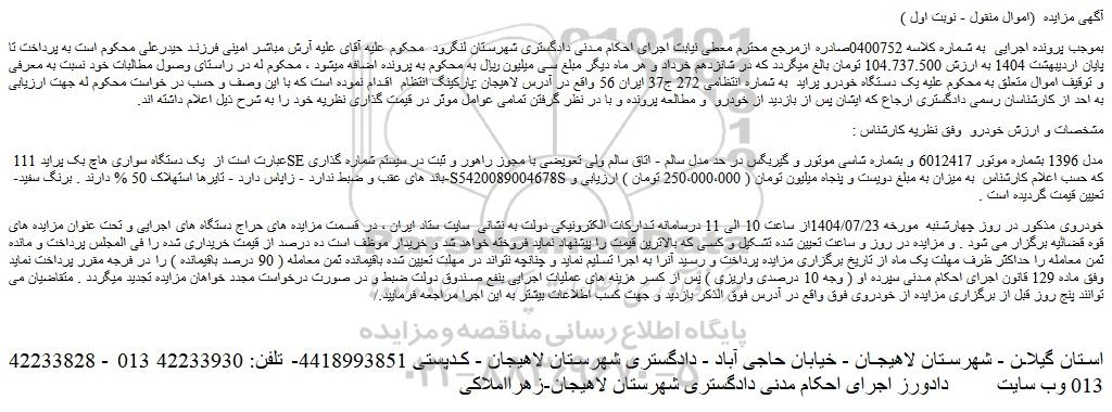 خودروی مذکور در روز چهارشنبه  مورخه 1404/07/23از ساعت 10 الی 11 درسامانه تدارکات الکترونیکی دولت به نشانی  سایت ستاد ایران ، در قسمت مزایده های حراج دستگاه های اجرایی و تحت عنوان مزایده های قوه قضائیه برگزار می شود . و مزایده در روز و ساعت تعیین شده تشکیل و کسی که بالاترین قیمت را پیشنهاد نماید فروخته خواهد شد و خریدار موظف است ده درصد از قیمت خریداری شده را فی المجلس پرداخت و مانده ثمن معامله را حداکثر ظرف مهلت یک ماه از تاریخ برگزاری مزایده پرداخت و رسید آنرا به اجرا تسلیم نماید و چنانچه نتواند در مهلت تعیین شده باقیمانده ثمن معامله ( 90 درصد باقیمانده ) را در فرجه مقرر پرداخت نماید وفق ماده 129 قانون اجرای احکام مدنی سپرده او ( وجه 10 درصدی واریزی ) پس از کسر هزینه های عملیات اجرایی بنفع صندوق دولت ضبط و در صورت درخواست مجدد خواهان مزایده تجدید میگردد . متقاضیان می توانند پنج روز قبل از برگزاری مزایده از خودروی فوق واقع در آدرس فوق الذکر بازدید و جهت کسب اطلاعات بیشتر به این اجرا مراجعه فرمایید./