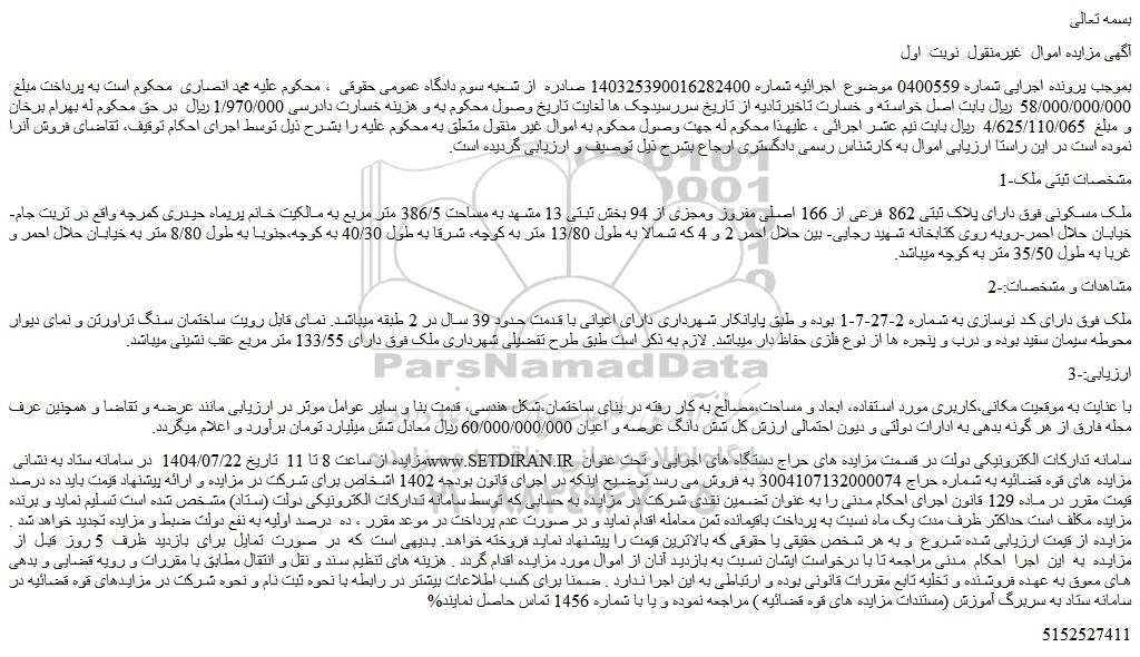 بموجب پرونده اجرایی شماره 0400559 موضوع  اجرائیه شماره 140325390016282400 صادره  از شعبه سوم دادگاه عمومی حقوقی  ، محکوم علیه محمد انصاری  محکوم است به پرداخت مبلغ  58/000/000/000  ریال بابت اصل خواسته و خسارت تاخیرتادیه از تاریخ سررسیدچک ها لغایت تاریخ وصول محکوم به و هزینه خسارت دادرسی 1/970/000 ریال  در حق محکوم له بهرام برخان و مبلغ  4/625/110/065  ریال بابت نیم عشر اجرائی ، علیهذا محکوم له جهت وصول محکوم به اموال غیر منقول متعلق به محکوم علیه را بشرح ذیل توسط اجرای احکام توقیف، تقاضای فروش آنرا نموده است در این راستا ارزیابی اموال به کارشناس رسمی دادگستری ارجاع بشرح ذیل توصیف و ارزیابی گردیده است.