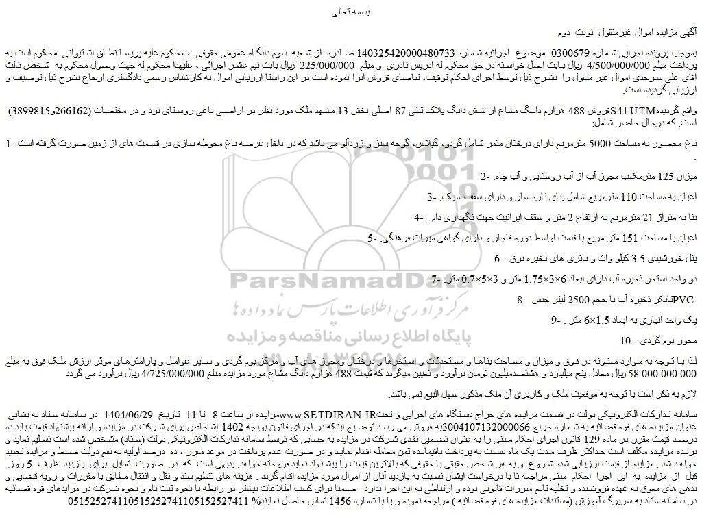 بموجب پرونده اجرایی شماره 0300679 موضوع اجرائیه شماره 140325420000480733 صادره از شعبه سوم دادگاه عمومی حقوقی ، محکوم علیه پریسا نطاق اشتیوانی محکوم است به پرداخت مبلغ 4/500/000/000 ریال بابت اصل خواسته در حق محکوم له ادریس نادری و مبلغ 225/000/000 ریال بابت نیم عشر اجرائی ، علیهذا محکوم له جهت وصول محکوم به شخص ثالث اقای علی سرحدی اموال غیر منقول را بشرح ذیل توسط اجرای احکام توقیف، تقاضای فروش آنرا نموده است در این راستا ارزیابی اموال به کارشناس رسمی دادگستری ارجاع بشرح ذیل توصیف و ارزیابی گردیده است.