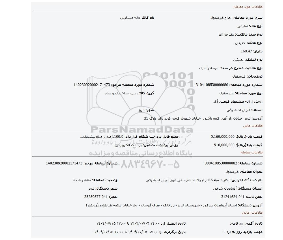 | شرح مورد معامله: حراج غیرمنقول | نام کالا: خانه مسکونی | |