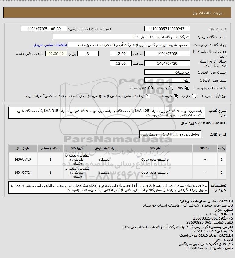 شرح کلی نیاز: ترانسفورماتور سه فاز هوایی با توان 125 kVA یک دستگاه و ترانسفورماتور سه فاز هوایی با توان 315 kVA یک دستگاه طبق مشخصات فنی و وندور لیست پیوست