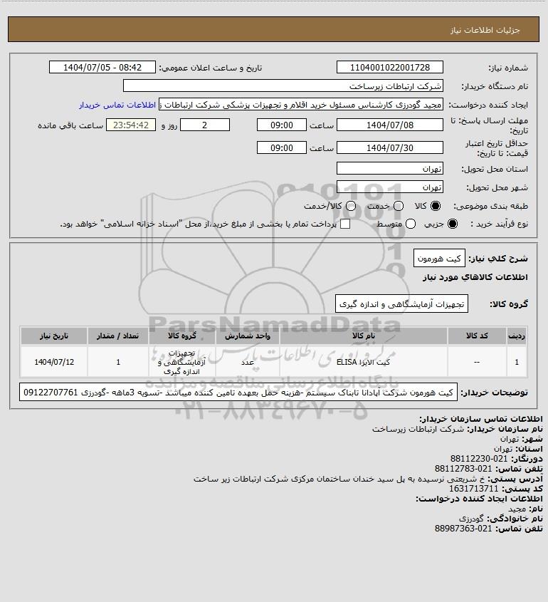 توضیحات خریدار:کیت هورمون شرکت آپادانا تابناک سیستم -هزینه حمل بعهده تامین کننده میباشد -تسویه 3ماهه -گودرزی 09122707761