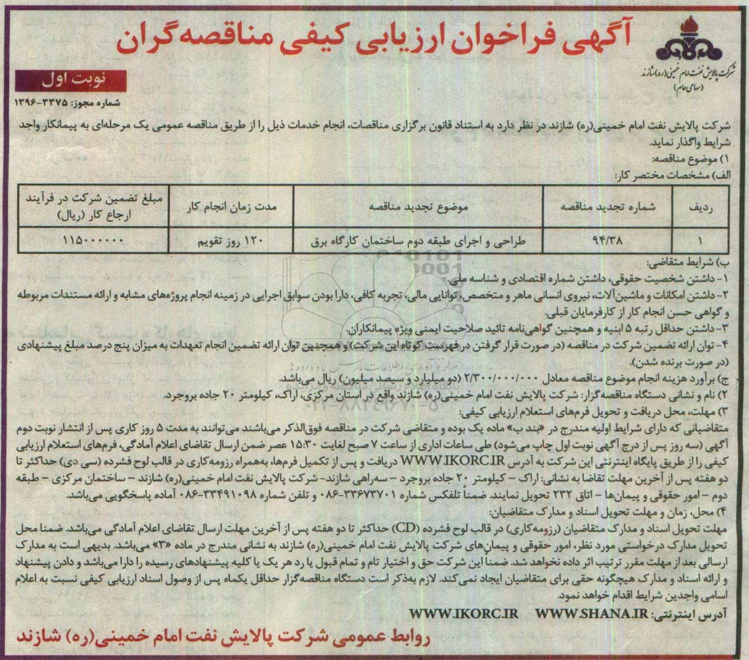 مناقصه طراحی و اجرای طبقه دوم ساختمان کارگاه, فراخوان ارزیابی کیفی مناقصه گران, مناقصه طراحی و اجرای طبقه دوم ساختمان کارگاه
