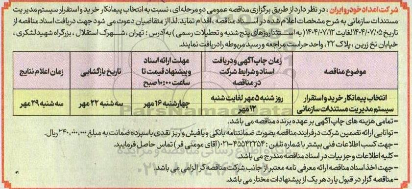 شرکت امداد خودرو ایران در نظر دارد از طریق برگزاری مناقصه عمومی دو مرحله ای نسبت به انتخاب پیمانکار خرید و استقرار سیستم مدیریت مستندات سازمانی به شرح مشخصات اعلام شده در اسناد مناقصه ، اقدام نماید. لذا از متقاضیان دعوت میشود جهت دریافت اسناد مناقصه از تاریخ 1404.7.5 لغایت 1404.7.12 به استثنا روزهای پنج شنبه و تعطیلات رسمی به آدرس : تهران شهرک استقلال ، بزرگراه شهید لشکری خیابان نخ زرین، پلاک 22 واحد حراست مراجعه و رسید مربوطه را دریافت نمایند.