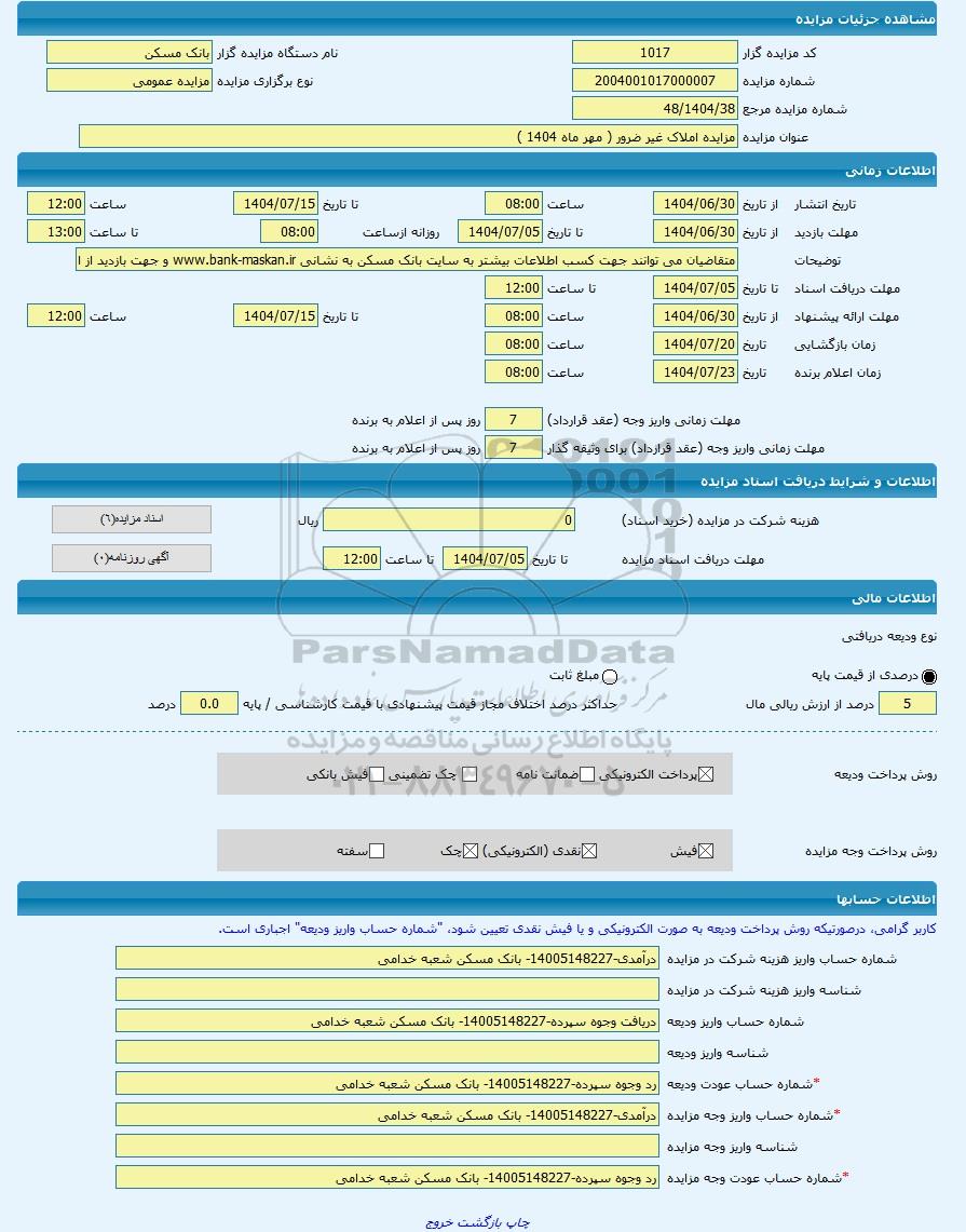 | شماره حساب واریز وجه مزایده | درآمدی-14005148227- بانک مسکن شعبه خدامی |