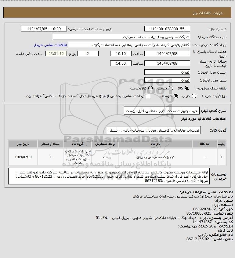 | 1 | -- | تجهیزات دسترسی رادیویی | عدد | تجهیزات مخابراتی، کامپیوتر، موبایل، ملزومات جانبی و شبکه | 1 | 1404/07/10 |