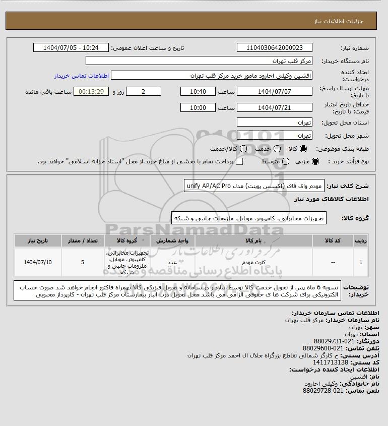 | 1 | -- | کارت مودم | عدد | تجهیزات مخابراتی، کامپیوتر، موبایل، ملزومات جانبی و شبکه | 5 | 1404/07/10 |