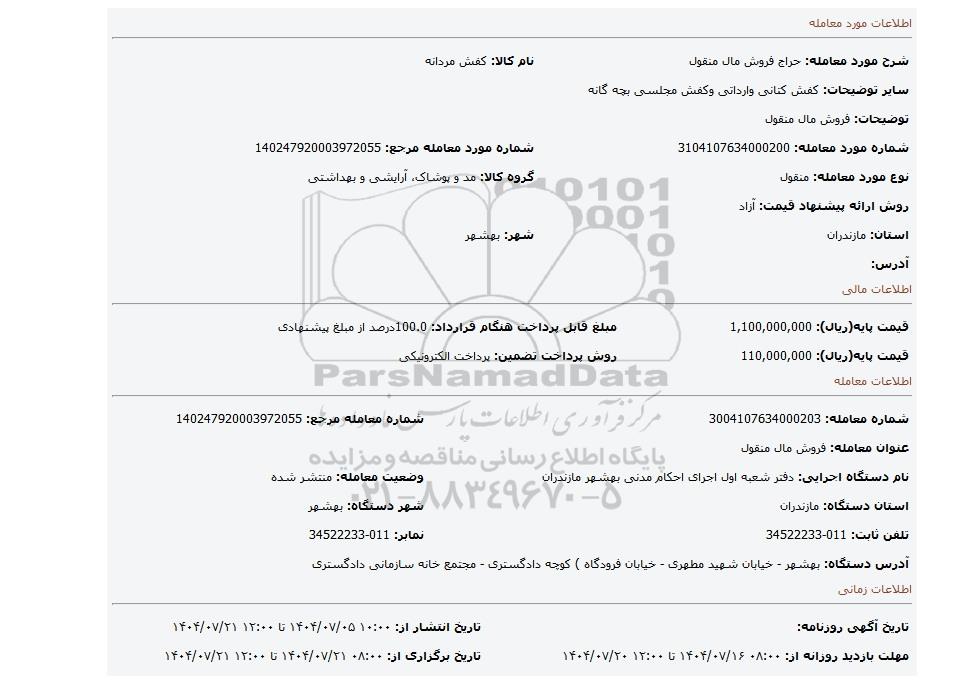 | شرح مورد معامله: حراج فروش مال منقول | نام کالا: کفش مردانه | |