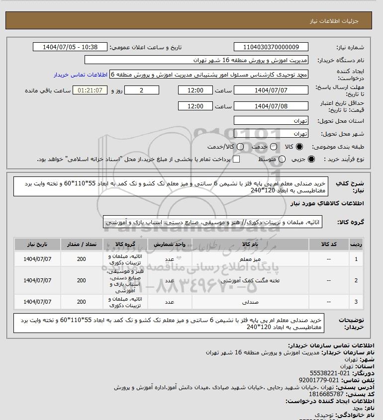 نام دستگاه خریدار:مدیریت اموزش و پرورش منطقه 16 شهر تهران
