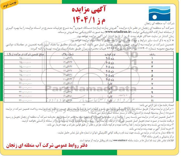 شرکت آب منطقه ای زنجان در نظر دارد مزایده فروش 11 (یازده) دستگاه خودرو به شرح جزئیات مندرج در اسناد مزایده را با بهره گیری از سامانه تدارکات الکترونیکی دولت (ستاد ایران) به صورت الکترونیکی به فروش برساند.