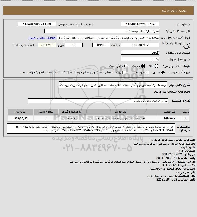 شرح کلی نیاز: توسعه برق رسانی و واگذاری برق DC در رشت مطابق شرح ضوابط و مقررات پیوست