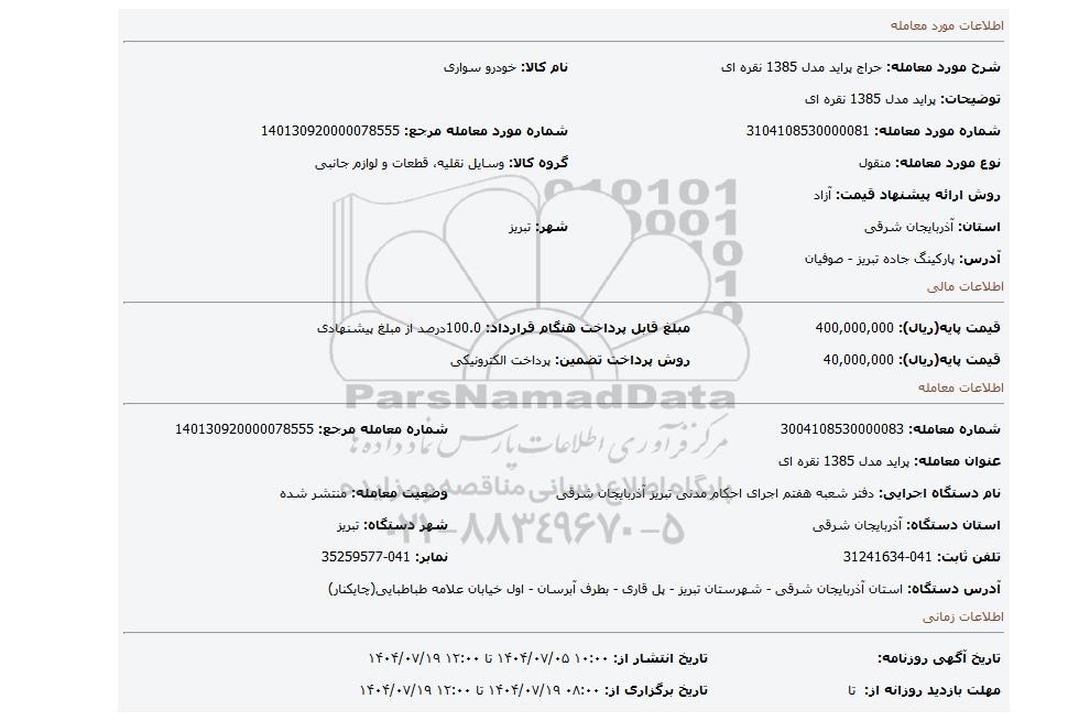 | نوع مورد معامله: منقول | گروه کالا: وسایل نقلیه، قطعات و لوازم جانبی | |