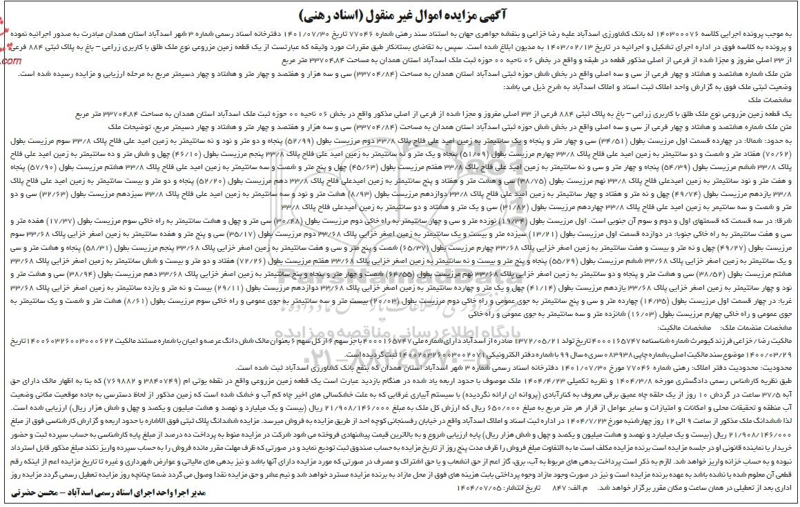 به موجب پرونده اجرایی کلاسه 140300076 له بانک کشاورزی اسد آباد علیه رضا خزاعی و بنفشه جواهری جهان به استناد سند رهنی شماره 77046 تاریخ 1401.07.30 دفترخانه اسناد رسمی شماره 3 شهر اسدآباد استان همدان مبادرت به صدور اجرائیه نموده . و پرونده به کلاسه فوق در اداره اجرای تشکیل و اجرائیه در تاریخ 1403.02.13 به مدیون ابلاغ شده است. سپس به تقاضای بستانکار طبق مقررات مورد وثیقه که عبارتست از یک قطعه زمین مزروعی نوع ملک طلق با کاربری زراعی - باغ به پلاک ثبتی 884 فرعی از 34 اصلی مفرور و مجزا شده از فرعی از اصلی مذکور قطعه در طبقه و واقع در بخش 06 ناحیه حوزه ثبت ملک اسدآباد استان همدان به مساحت 3370484 متر مربع متن ملک شماره هفتصد و هفتاد و چهار فرعی از سی و سه اصلی واقع در بخش شنان حوزه ثبتی اسدآباد استان همدان به مساحت (33704.84) سی و سه هزار و هفتصد و چهار متر و هفتاد و چهار دسیمتر مربع به مرحله ارزیابی و مزایده رسیده شده است. وضعیت ثبتی ملک فوق به گزارش واحد املاک ثبت اسناد و املاک اسد آباد به شرح ذیل می باشد.