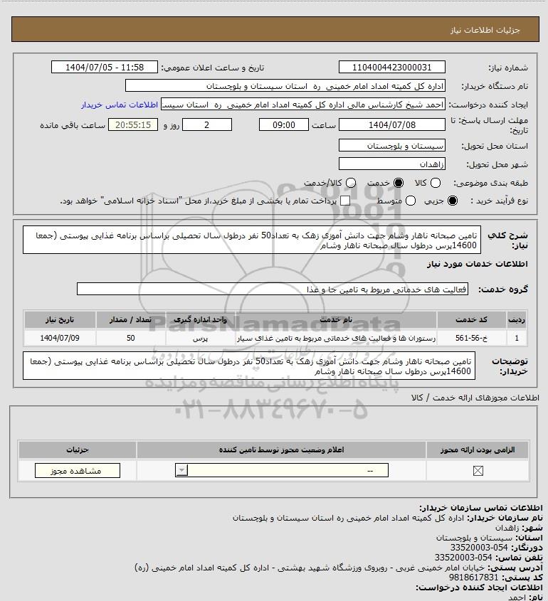 شرح کلی نیاز: تامین صبحانه ناهار وشام جهت دانش آموزی زهک به تعداد50 نفر درطول سال تحصیلی براساس برنامه غذایی پیوستی (جمعا 14600پرس درطول سال صبحانه ناهار وشام