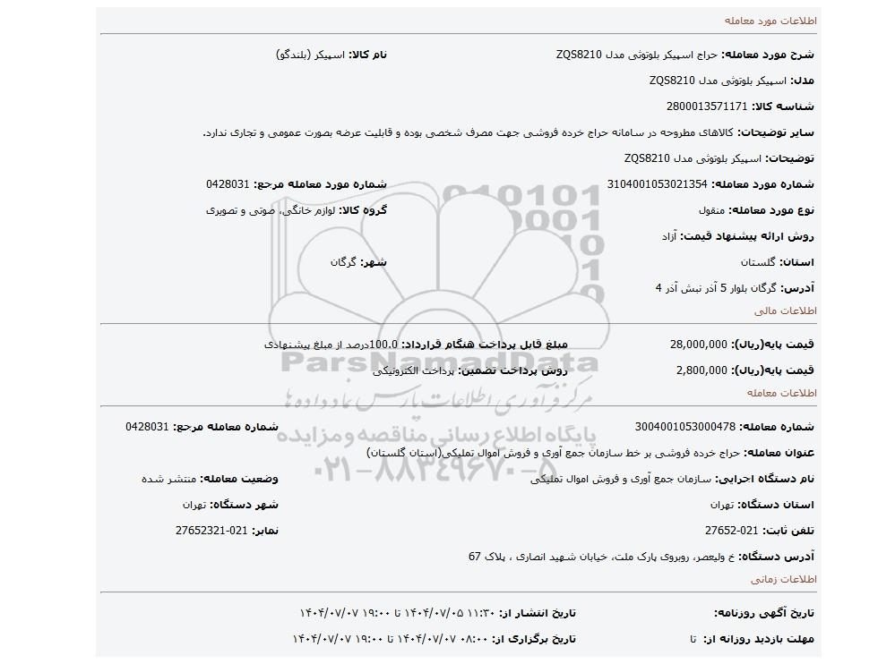 | عنوان معامله: حراج خرده فروشی بر خط سازمان جمع آوری و فروش اموال تملیکی(استان گلستان) | ||