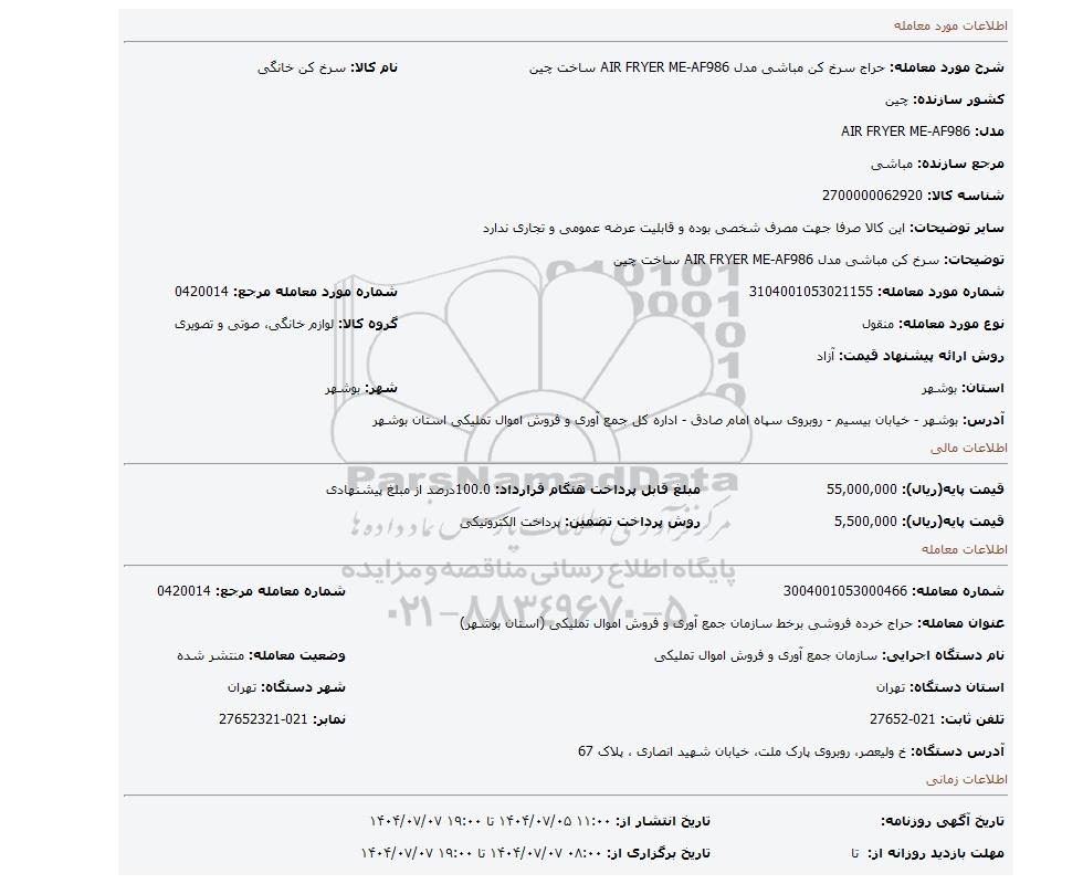 عنوان معامله: حراج خرده فروشی برخط سازمان جمع آوری و فروش اموال تملیکی (استان بوشهر)