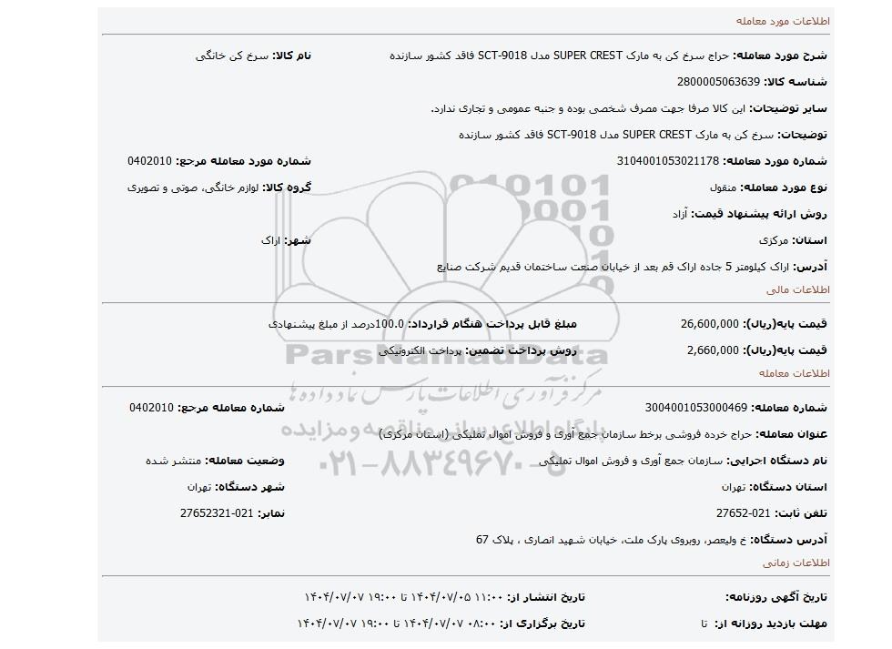 | شرح مورد معامله: حراج سرخ کن به مارک SUPER CREST مدل SCT-9018 فاقد کشور سازنده | نام کالا: سرخ کن خانگی | |