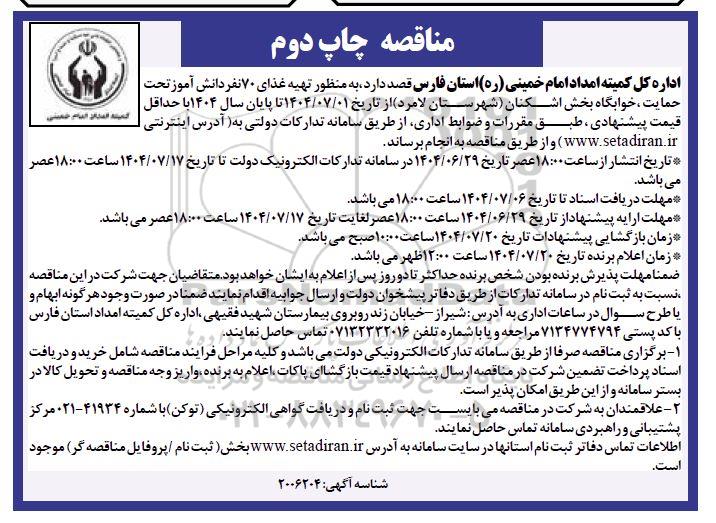 اداره کل کمیته امداد امام خمینی (ره) استان فارس قصد دارد، به منظور تهیه غذای 70 نفر دانش آموز تحت حمایت، خوابگاه بخش اشکنان (شهرستان لامرد) از تاریخ 1404.07.01 تا پایان سال 1404 با حداقل قیمت پیشنهادی ، طبق مقررات و ضوابط اداری، از طریق سامانه تدارکات دولتی به (آدرس اینترنتی ستاد ایران) و از طریق مناقصه به انجام برساند .