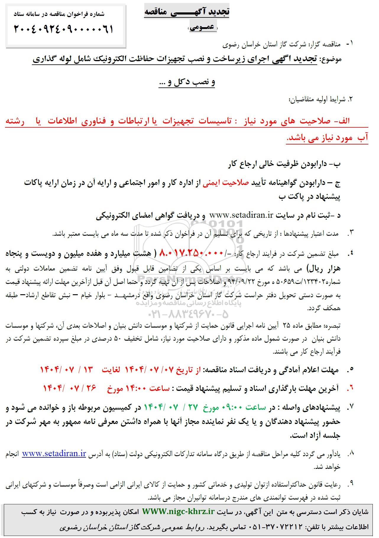موضوع تجدید آگهی اجرای زیر ساخت و نصب تجهیزات حفاظت الکترونیک شامل لوله گذاری و نصب دکل و .....