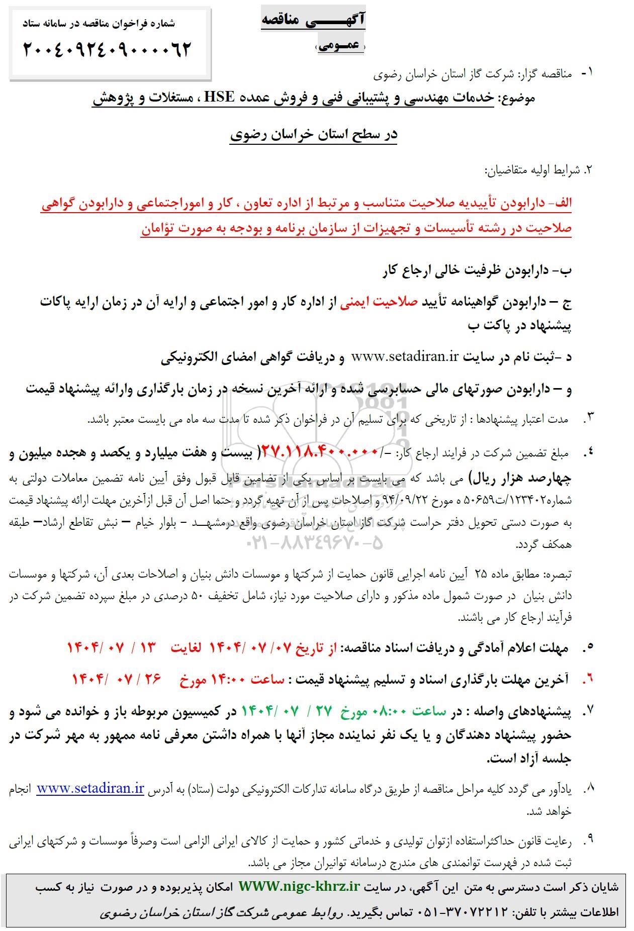 شایان ذکر است دسترسی به متن این آگهی در سایت www.nigc-khrz.ir امکان پذیر بوده و در صورت نیاز به کسب اطلاعات بیشتر با تلفن 37072212-051 تماس بگیرید.