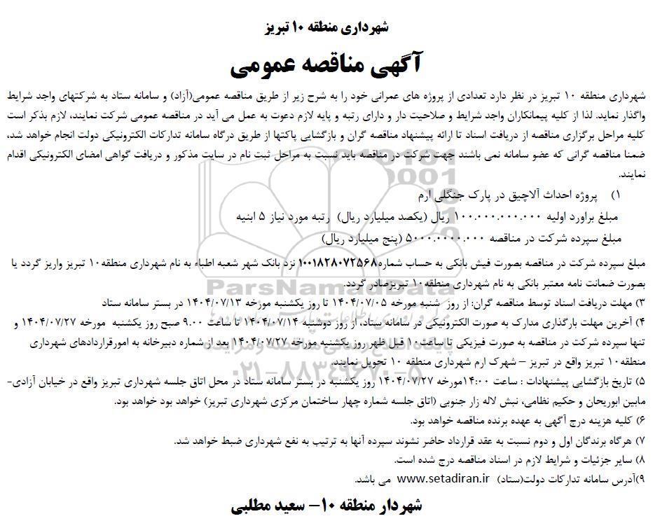 شهرداری منطقه 10 تبریز در نظر دارد تعدادی از پروژه های عمرانی خود را به شرح زیر از طریق مناقصه عمومی (آزاد) و سامانه ستاد به شرکتهای واجد شرایط واگذار نماید. لذا از کلیه پیمانکاران واجد شرایط و صلاحیت دار و دارای رتبه و پایه لازم دعوت به عمل می آید در مناقصه عمومی شرکت نمایند. لازم بذکر است کلیه مراحل برگزاری مناقصه از دریافت اسناد تا ارائه پیشنهاد مناقصه گران و بازگشایی پاکتها از طریق درگاه سامانه ندارکات الکترونیکی دولت انجام خواهد شد. ضمنا مناقصه گرانی که عضو سامانه نمی باشند جهت شرکت در مناقصه باید نسبت به مراحل ثبت نام در سایت مذکور و دریافت گواهی امضای الکترونیکی اقدام نمایند.