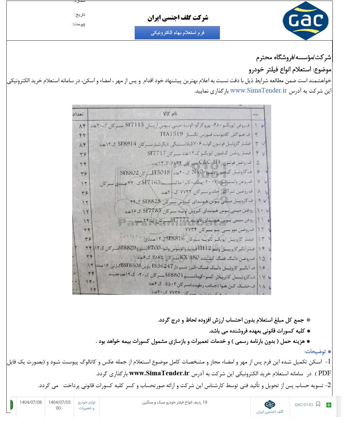 استعلام بها و موضوع استعلام استعلام انواع فیلتر خودرو سبک و سنگین به اطلاع کلیه شرکتها و افراد متخصص واجد شرایط میرساند، آگهی گذار در نظر دارد از طریق استعلام بها، نسبت به انتخاب و دریافت پیشنهادات اقدام نماید. این استعلام با کد آگهی ثبت شده در سامانه خبرگزاری پارس نماد : 9605641 منتشر شده است. مشخصات استعلام : تاریخ شروع استعلام: 1404/07/05 آخرین مهلت ارسال پیشنهاد قیمت : 1404/07/08 و محل اجرای پروژه : استان سایر میباشد. استعلام قیمت مورد درخواست : استعلام انواع فیلتر خودرو سبک و سنگین با دستهبندیهای تخصصی و گروه های مرتبط : انواع فیلتر های تصفیه, تامین،تعمیرات و اجاره خودروهای سنگین و نیمه سنگین, قطعات خودرو, استعلام اطلاع رسانی میگردد.