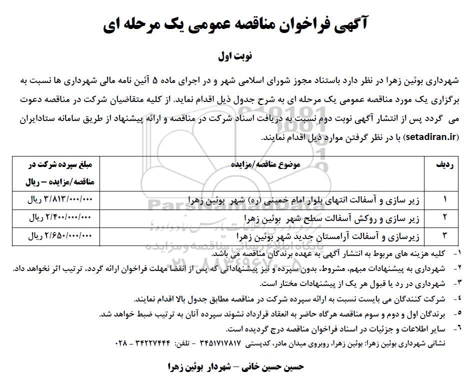 شهرداری بوئین زهرا در نظر دارد باستناد مجوز شورای اسلامی شهر و در اجرای ماده 5 آئین نامه مالی شهرداری ها نسبت به برگزاری یک مورد مناقصه عمومی یک مرحله ای به شرح جدول ذیل اقدام نماید از کلیه متقاضیان شرکت در مناقصه دعوت می گردد پس از انتشار آگهی نوبت دوم نسبت به دریافت اسناد شرکت در مناقصه و ارائه پیشنهاد از طریق سامانه ستاد ایران (ستاد ایران) با در نظر گرفتن موارد ذیل اقدام نمایند.