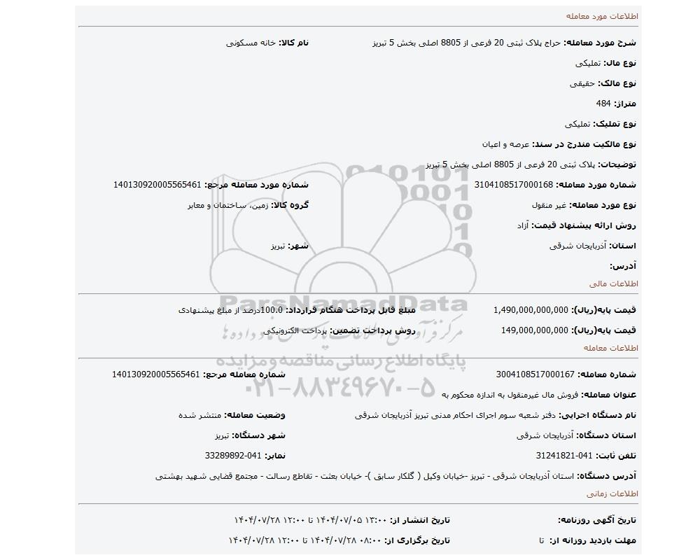 | شرح مورد معامله: حراج پلاک ثبتی 20 فرعی از 8805 اصلی بخش 5 تبریز | نام کالا: خانه مسکونی | |