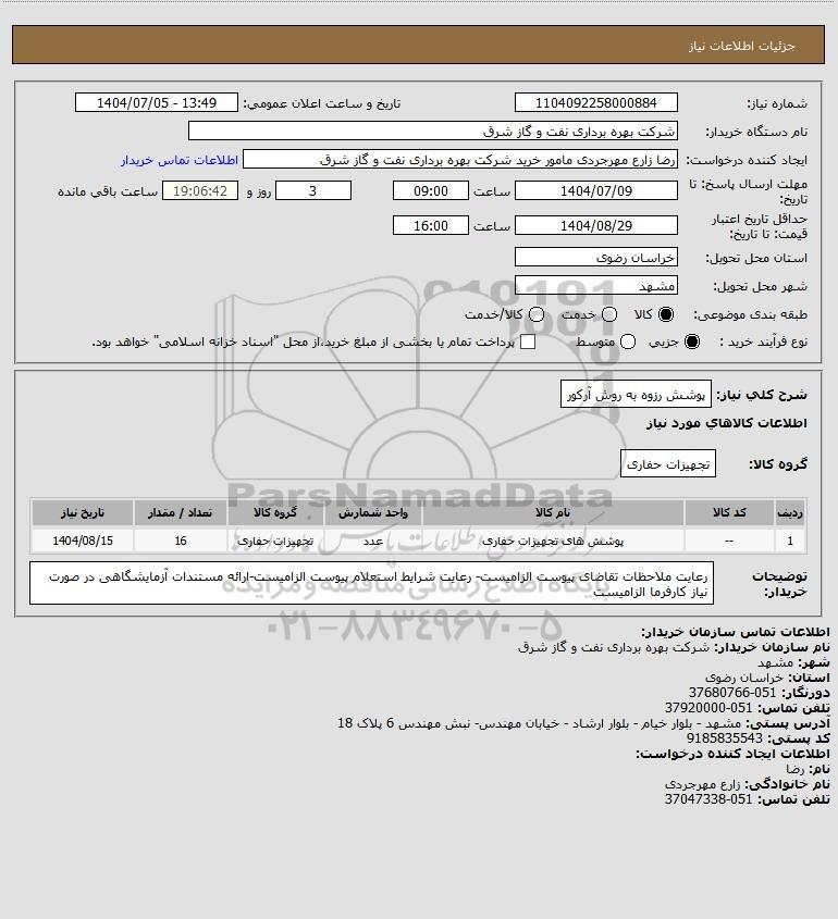 | 1 | -- | پوشش های تجهیزات حفاری | عدد | تجهیزات حفاری | 16 | 1404/08/15 |