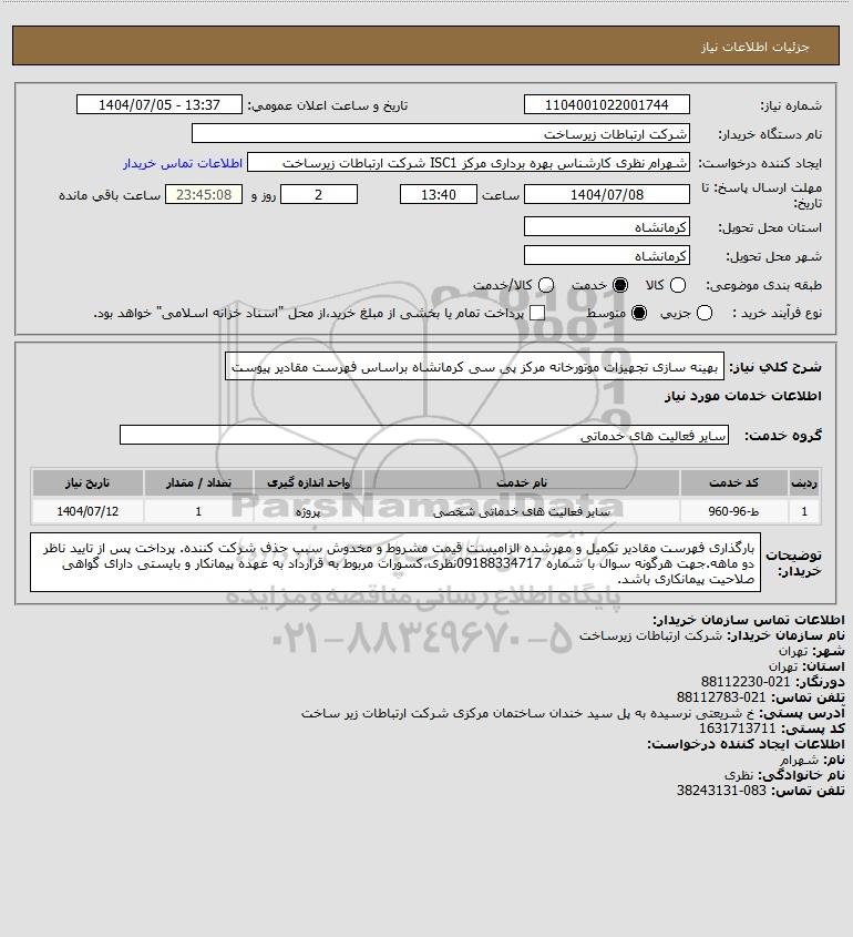 شرح کلی نیاز: بهینه سازی تجهیزات موتورخانه مرکز پی سی کرمانشاه براساس فهرست مقادیر پیوست