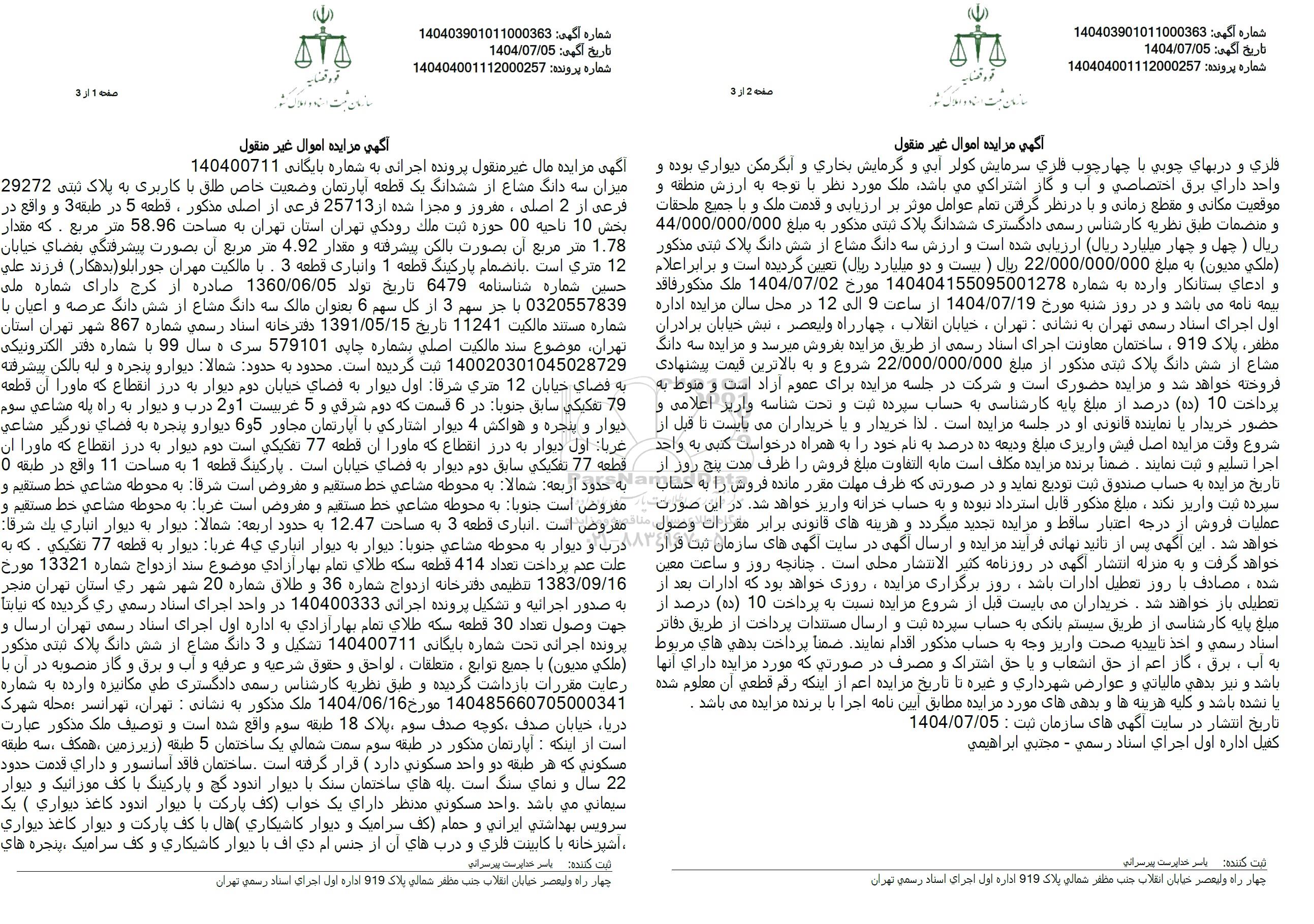 آگهی مزایده مال غیر منقول پرونده اجرائی به شماره بایگانی 140400711 میزان سه دانگ مشاع از ششدانگ یک قطعه آپارتمان وضعیت خاص طلق با کاربری به پلاک ثبتی 29272 فرعی از 2 اصلی، مفروز و مجرا شده از 25713 فرعی از اصلی مذکور، قطعه 5 در طبقه 3 و واقع در بخش 10 ناحیه 00 حوزه ثبت ملک رودکی تهران استان تهران به مساحت 58.96 متر مربع . که مقدار 1.78 متر مربع آن بصورت بالکن پیشرفته و مقدار 4.92 متر مربع آن بصورت پیشرفتگی بفضای خیابان 12 متری است بانضمام پارکینگ قطعه 1 و انباری قطعه 3 . با مالکیت مهران جورابلو (بدهکار) فرزند علی حسین شماره شناسنامه 6479 تاریخ تولد 1360/06/05 صادره از کرج دارای شماره ملی 0320557839 با جز سهم 3 از کل سهم 6 بعنوان مالک سه دانگ مشاع از شش دانگ عرصه و اعیان با شماره مستند مالکیت 11241 تاریخ 1391.05.15 دفترخانه اسناد رسمی شماره 867 شهر تهران استان تهران موضوع سند مالکیت اصلی بشماره چاپی 579101 سری 5 سال 99 با شماره دفتر الکترونیکی 140020301045028729 ثبت گردیده است. محدود به حدود شمالا دیوار و پنجره و لبه بالکن پیشرفته به فضای خیابان 12 متری شرقا اول دیوار به فضای خیابان دوم دیوار به درز انقطاع که ماورا آن قطعه 79 تفکیکی سابق جنوبا در 6 قسمت که دوم شرقی و 5 غربیست 1 و 2 درب و دیوار به راه پله مشاعی سوم دیوار و پنجره و هواکش 4 دیوار اشتارکی با آپارتمان مجاور 5 و 6 دیوار و پنجره به فضای نورگیر مشاعی غربا اول دیوار به درز انقطاع که ماورا آن قطعه 77 تفکیکی است دوم دیوار به درز انقطاع که ماورا آن قطعه 77 تفکیکی سابق دوم دیوار به فضای خیابان است. پارکینگ قطعه 1 به مساحت 11 واقع در طبقه 0 به حدود اربعه شمالا به محوطه مشاعی خط مستقیم و مفروض است شرقا به محوطه مشاعی خط مستقیم و مفروض است جنوبا به محوطه مشاعی خط مستقیم و مفروض است غربا به محوطه مشاعی خط مستقیم و مفروض است انباری قطعه 3 به مساحت 12.47 به حدود اربعه شمالا دیوار به دیوار انباری یک شرقا درب و دیوار به محوطه مشاعی جنوبا دیوار به دیوار انباری ی 4 غربا دیوار به قطعه 77 تفکیکی . که به علت عدم پرداخت تعداد 414 قطعه سکه طلای تمام بهار آزادی موضوع سند ازدواج شماره 13321 مورخ 1383/09/16 تنظیمی دفتر خانه ازدواج شماره 36 و طلاق شماره 20 شهر شهر ری استان تهران منجر به صدور اجرائیه و تشکیل پرونده اجرائی 140400333 در واحد اجرای اسناد رسمی ری گردیده که نیابتا جهت وصول تعداد 30 قطعه سکه طلای تمام بهار آزادی به اداره اول اجرای اسناد رسمی تهران ارسال و پرونده اجرائی تحت شماره بایگانی 140400711 تشکیل و 3 دانگ مشاع از شش دانگ پلاک ثبتی مذکور ملکی (مدیون با جمیع توابع، متعلقات ، لواحق و حقوق شرعیه و عرفیه و آب و برق و گاز منصوبه در آن با رعایت مقررات بازداشت گردیده و طبق نظریه کارشناس رسمی دادگستری طی مکانیزه وارده به شماره 140485660705000341 مورخ 1404.06.16 ملک مذکور به نشانی: تهران تهرانسر محله شهرک دریا خیابان صدف کوچه صدف سوم ، پلاک 18 طبقه سوم واقع شده است و توصیف ملک مذکور عبارت است از اینکه آپارتمان مذکور در طبقه سوم سمت شمالی یک ساختمان 5 طبقه زیرزمین ، همکف ، سه طبقه مسکونی که هر طبقه دو واحد مسکونی دارد ( قرار گرفته است . ساختمان فاقد آسانسور و دارای قدمت حدود 22 سال و نمای سنگ است پله های ساختمان سنک با دیوار اندود گچ و پارکینگ با کف موزائیک و دیوار سیمانی می باشد واحد مسکونی مدنظر دارای یک خواب کف) پارکت با دیوار اندود کاغذ دیواری ) یک سرویس بهداشتی ایرانی و حمام کف سرامیک و دیوار کاشیکاری هال با کف پارکت و دیوار کاغذ دیواری آشپزخانه با کابینت فلزی و دربهای آن از جنس ام دی اف با دیوار کاشیکاری و کف سرامیک ، پنجره های فلزی و دربهای چوبی با چهارچوب فلزی سرمایش کولر آبی و گرمایش بخاری و آبگرمکن دیواری بوده و واحد دارای برق اختصاصی و آب و گاز اشتراکی می باشد ملک مورد نظر با توجه به ارزش منطقه و موقعیت مکانی و مقطع زمانی و با در نظر گرفتن تمام عوامل موثر بر ارزیابی و قدمت ملک و با جمیع ملحقات و منضمات طبق نظریه کارشناس رسمی دادگستری ششدانگ پلاک ثبتی مذکور ب