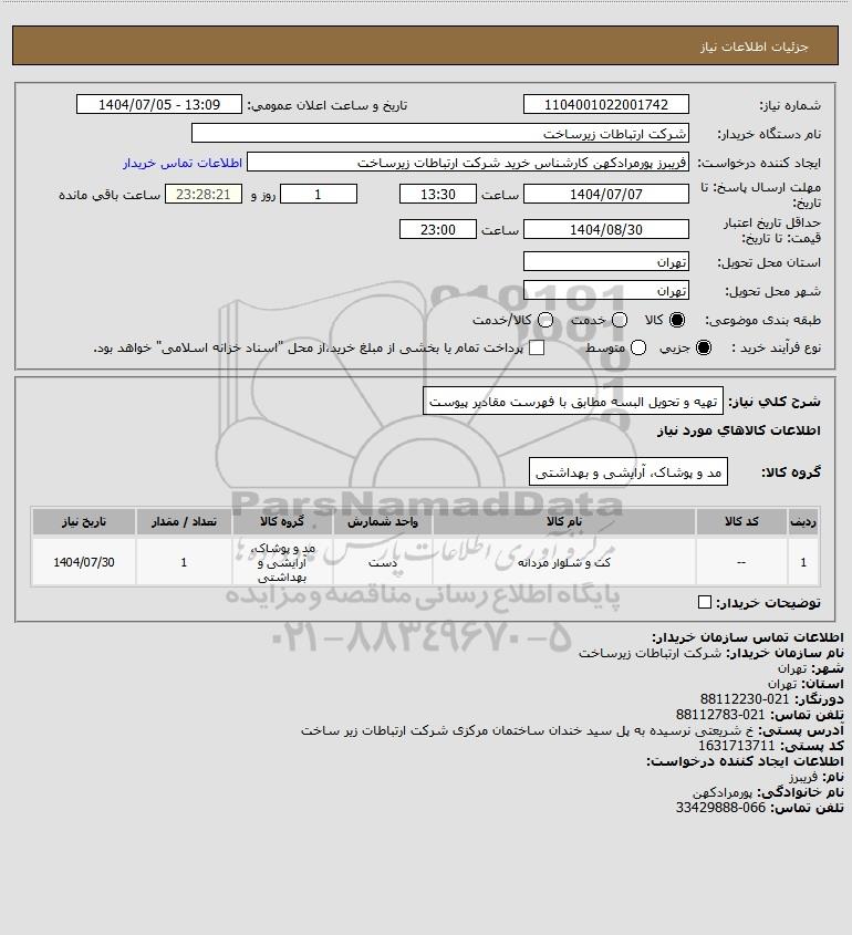 شرح کلی نیاز: تهیه و تحویل البسه مطابق با فهرست مقادیر پیوست