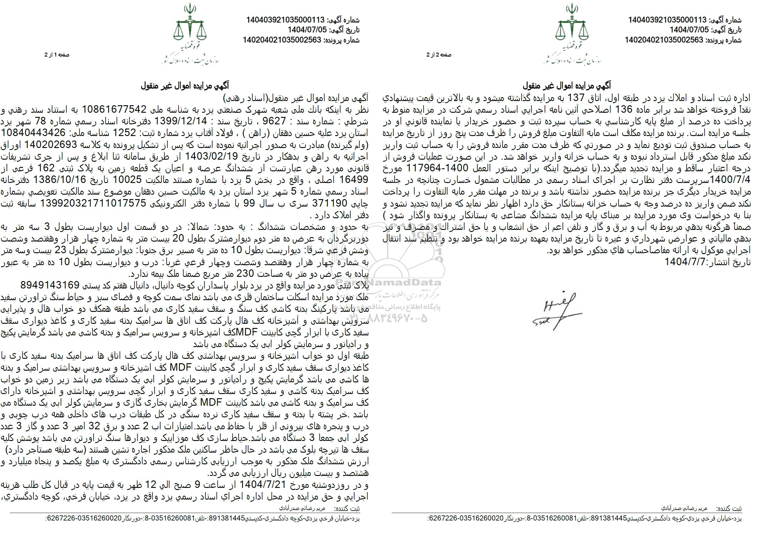 آگهی مزایده اموال غیر منقول استاد رهنی)
