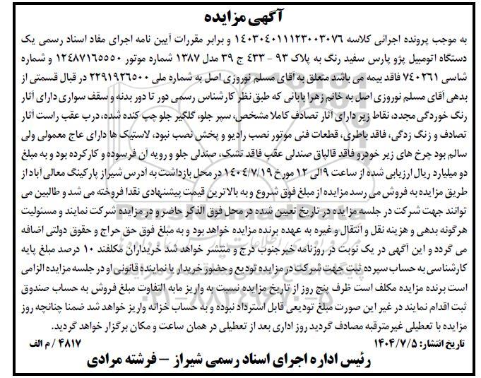 به موجب پرونده اجرائی کلاسه 140304011123003076 و برابر مقررات آیین نامه اجرای مفاد اسناد رسمی یک دستگاه اتومبیل پژو پارس سفید رنگ به پلاک 93-39433 مدل 1387 شماره موتور 12487165550 و شماره شاسی 740261 فاقد بیمه می باشد متعلق به آقای مسلم نوروزی اصل به شماره ملی 2291926500 در قبال قسمتی از بدهی آقای مسلم نوروزی اصل به خانم زهرا بابائي که طبق نظر کارشناس رسمی دور تا دور بدنه و سقف سواری دارای آثار رنگ خوردگی مجدد - نقاط زیر دارای آثار تصادف کاملا مشخص - سپر جلو - گلگیر جلو چپ کنده شده درب عقب راست آثار تصادف و زنگ زدگی -فاقد باطری قطعات فنی موتور نصب رادیو و پخش نصب نبود لاستیکها دارای عاج معمولی ولی سالم بود چرخ های زیر خودرو فاقد قالپاق صندلی عقب فاقد تشك - صندلی جلو و رویه آن فرسوده و کارکرده بود و به مبلغ دو میلیارد ریال ارزیابی شده از ساعت 9 الی 12 مورخ 1404.7.19 در محل بازداشت به آدرس شیراز پارکینگ معالی آباد از طریق مزایده به فروش می رسد مزایده از مبلغ فوق شروع و به بالاترین قیمت پیشنهادی نقداً فروخته میشد و طالبین میتوانند جهت شرکت در جلسه مزایده در تاریخ تعیین شده در محل فوق الذکر حاضر و در مزایده شرکت نمایند و مسئولیت هرگونه بدهی و هزینه نقل و انتقال و غیره به عهده برنده مزایده خواهد بود و به مبلغ فوق حق حراج و حقوق دولتی اضافه میگرد و این آگهی در یک نوبت در روزنامه خبر جنوب درج و منتشر خواهد شد خریداران مکلفند 10 درصد مبلغ پایه کارشناسی به حساب سپرده ثبت جهت شرکت در مزایده تودیع و حضور خریدار یا نماینده قانونی او در جلسه مزایده الزامی است برنده مزایده مکلف است ظرف پنج روز از تاریخ مزایده نسبت به واريز ما به التفاوت مبلغ فروش به حساب صندوق ثبت اقدام نمایند در غیر اینصورت مبلغ تودیعی قابل استرداد نبوده و به حساب خزانه واریز خواهد شد ضمنا" چنانچه روز مزایده با تعطیلی غیر مترقبه مصادف گردید روز اداری بعد از تعطیلی مزایده در همان ساعت و همان مکان برگزار خواهد گردید .