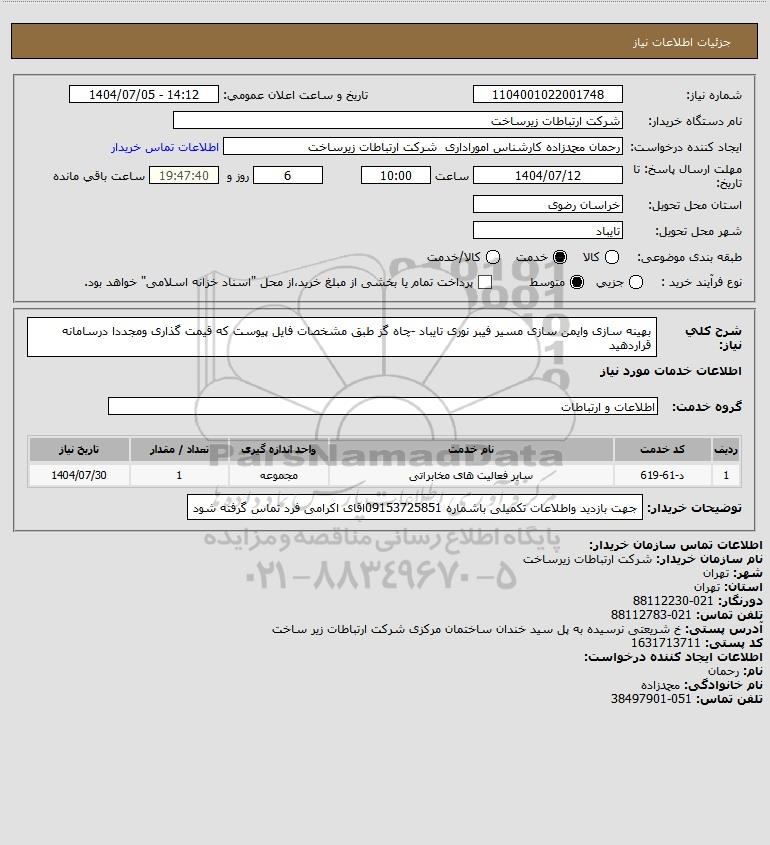 شرح کلی نیاز: بهینه سازی وایمن سازی مسیر فیبر نوری تایباد -چاه گز طبق مشخصات فایل پیوست که قیمت گذاری ومجددا درسامانه قراردهید