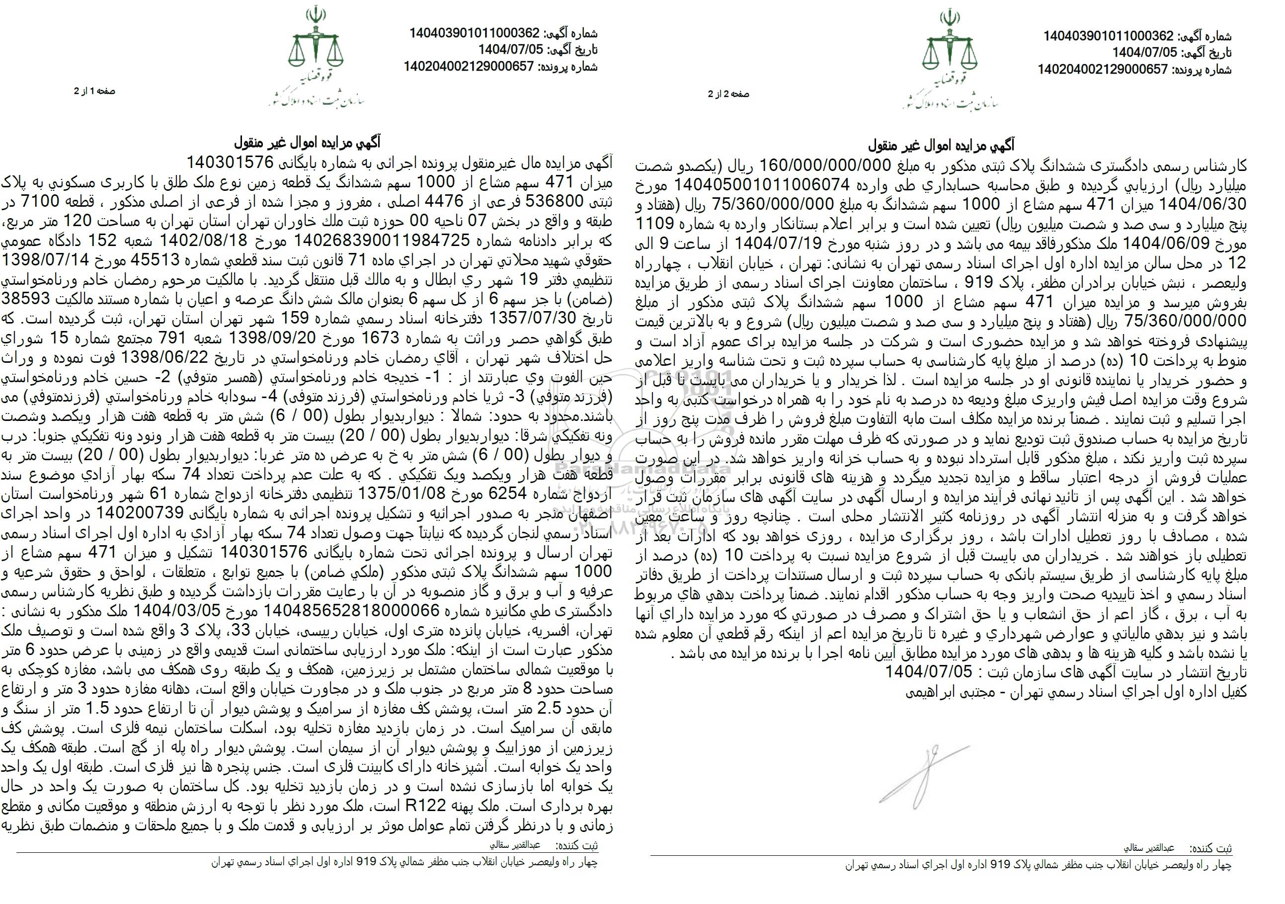 میران 471 سهم صناع از 1000 سهم ششدانگ یک قطعه زمین نوع ملک طلق با کاربری مسکونی به پلاک ثبتی 536800 فرعی از 4476 اصلی، مغرور و مجزا شده از فرعی از اصلی مذکور ، قطعه 7100 در طبقه و واقع در بخش 07 ناحیه 00 حوزه ثبت ملک خاوران تهران استان تهران به مساحت 120 متر مربع که برابر دادنامه شماره 140268390011984725 مورخ 1402/08/18 شعبه 152 دادگاه عمومد حقوقی شهید محلاتی تهران در اجرای ماده 71 قانون ثبت سند قطعی شماره 45513 مورخ 1398/07/14 تنظیمی دفتر 19 شهر ری ابطال و به مالک قبل منقل گردید. با مالکیت مرحوم رمضان خانم ورنامخواستی (ضامن) با جز منهم 6 از کل سهم 6 بعنوان مالک شش دانگ عرصه و اعیان با شماره مستند مالکیت 38593 تاریخ 1357/07/30 دفترخانه اسناد رسمی شماره 159 شهر تهران استان تهران ثبت گردیده است. که طبق گواهی حصر وراثت به شماره 1673 مورخ 1398/09/20 شعبة 791 مجتمع شماره 15 شورای ی حل اختلاف شهر تهران ، آقای رمضان خادم ورنامخواستی در تاریخ 1398/06/22 فوت نموده و وراث جین القوت وی عبارتند از : 1- خدیجه خانم ورنامخواستی (قصر صوفی) -2- حسین خادم ورنامخواستی افرزند متوفی ) -3- تر با خادم ورنامخواستی فرزند (متوفی) -4 سودانه خادم ورنامخواستی (فرزند متوفی) من باشند. محدود به حدود شمالا دیوار بدیوار بطول (6/00) شش متر به قطعه هفت هزار و یکصد و شصت و به تفکیکی شرقا دیوار بدیوار بطول 00 / 20) بیست متر به قطعه هفت قرار وبود و به تفکیکی جوبا درب و دیوار بطول (00 / 6) شش متر به خ به عرض ده متر عزبا دیوار بدیوار بطول (00 / 20) بیست متر به قطعه هفت قرار و یکصد و یک تفکیکی که به علت عدم پرداخت تعداد 74 سکه بهار آزادی موضوع سند ازدواج شماره 6254 مورخ 1375.01.08 تنظیمی دفترخانه ازدواج شماره 61 شهر ورنامخواست استان اصفهان منجر به صدور اجرائیه و تشکیل پرونده اجرانی به شماره بایگانی 140200739 در واحد اجرای اسناد رسمی لنجان گردیده که نیابتاً جهت وصول تعداد 74 سکه بهار آزادی به اداره اول اجرای استاد رسمی تهران ارسال و پرونده اجرائی تحت شماره بایگانی 140301576 تشکیل و میزان 471 سهم مشاع از 1000 سهم ششدانگ پلاک ثبتی مذکور ( ملکی صامت) با جمع توابع ، متعلقات ، لواحق و حقوق شرعیه و عرفه و آب و برق و کار منصوبه در آن با رعایت مقررات بازداشت گردیده و طبق نظریه کارشناس رسمی با دادگستری طی مکانیزه شماره 140485652818000066 مورخ 1404.03.05 ملک مذکور به نشانی ه تهران، السریة، خیابان پانزده هنری اول خیابان رئیسی خیابان 33 پلاک 3 واقع شده است و توصیف ملک مذکور عبارت است از اینکه ملک مورد ارزیابی ساختمانی است قدیمی واقع در رفتی با عرض حدود 6 متر با موقعیت شمالی ساختمان مشتمل بر زیرزمین همکک و یک طبقه روی همکف می باشد. مهاره کوچکی به صاحت حدود 8 متر مربع در جنوب ملک و در مجاورت خیابان واقع است. دهانه مغازه حدود 3 متر و ارتفاع آن حدود 2.5 متر است. پوشش یک مغازه از سرامیک و پوشش دیوار آن تا ارتفاع حدود 1.5 متر از سنگ و ما بقی آن سرامیک است. در زمان بازدید مغازه تخلیه بود. اسکلت ساختمان نیمه فلزی است. پوشش کف زیرزمین از موزاییک و پوشش دیوار آن از سیمان است. پوشش دیوار راه پله از گچ است. طبقه همکف یک واحد یک خوابه است. اشپز خانه دارای کاست فری است. جنس پنجره ها نیز فلزی است. طبقه اول یک واحد یک خوابه اما بازسازی نشده است و در زمان بازدید تخلیه بود کل ساختمان به صورت یک واحد در حال بهره برداری است. ملک بهنه R122 است. ملک مورد نظر با توجه به ارزش منطقه و موقعیت مکانی و مقطع زمانی و با در نظر گرفتن تمام عوامل موثر بر ارزیابی و قدمت ملک و با جمع ملحقات و منضمات طبق نظریه کارشناس رسمی دادگستری ششدانگ پلاک ثبتی مذکور به مبلغ 160/000/000/000 ریال (یکصد و شصت میلیارد ریال) ارزیابی گردیده و طبق محاسبه حسابداری على وارده 140405001011006074 مورخ 1404.06.30 میران 471 سهم مشاع از 1000 سهم ششدانگ به مبلغ 75.360.000.000 ریال (فضاد و پنج میلیارد و سی صد و شصت میلیون ریال تعیین شده است و برابر اعلام ستانکار وارده به شماره 1109 مورخ 1404.06.09 ملک مذکور فاقد بیمه می باشد و در روز شنبه مورخ 1404.07.19 از ساعت 9 الی 12 در محل سالن مزایده ادا