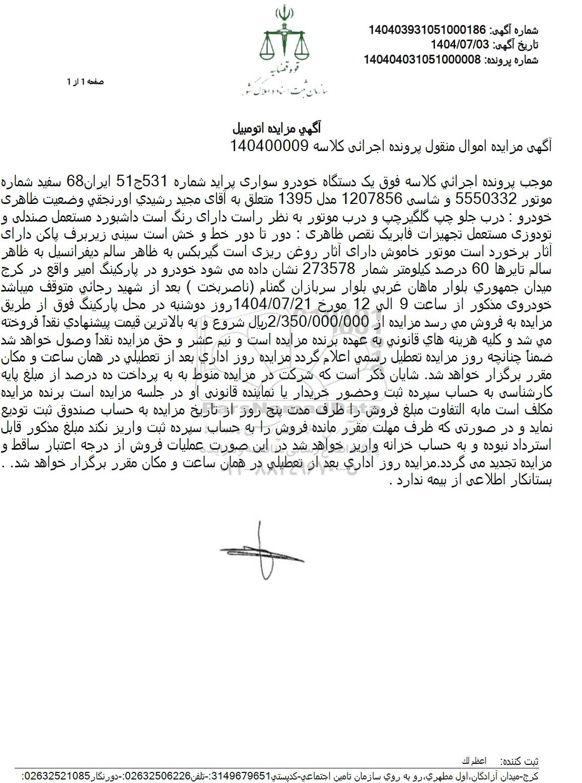 موجب پرونده اجرانی کلاسه فوق یک دستگاه خودرو سواری پراید شماره 51531 ایران 68 سفید شماره موتور 5550332 و شاسی 1207856 مدل 1395 متعلق به آقای مجید رشیدی اور نجقی وضعیت ظاهری خودرو : درب جلو چپ گلگیر چپ و درب موتور به نظر راست دارای رنگ است داشبورد مستعمل صندلی و تودوزی مستعمل تجهیزات فابریک نقص ظاهری : دور تا دور خط و خش است سینی زیر برف پاکن دارای آثار برخورد است موتور خاموش دارای آثار روغن ریزی است گیربکس به ظاهر سالم دیفرانسیل به ظاهر سالم تایرها 60 درصد کیلومتر شمار 273578 نشان داده میشود خودرو در پارکینگ امیر واقع در کرج میدان جمهوری بلوار ماهان غربی بلوار سربازان گمنام( ناصربخت ) بعد از شهید رجائی متوقف میباشد خودروی مذکور از ساعت 9 الی 12 مورخ 1404.07.21 روز دوشنبه در محل پارکینگ فوق از طریق مزایده به فروش می رسد مزایده از 2.350.000.000 ریال شروع و به بالاترین قیمت پیشنهادی نقدا فروخته می شد و کلیه هزینه های قانونی به عهده برنده مزایده است و نیم عشر و حق مزایده نقداً وصول خواهد شد ضمنا چنانچه روز مزایده تعطیل رسمی اعلام گردد مزایده روز اداری بعد از تعطیلی در همان ساعت و مکان مقرر برگزار خواهد شد. شایان ذکر است که شرکت در مزایده منوط به به پرداخت ده درصد از مبلغ پایه کارشناسی به حساب سپرده ثبت و حضور خریدار یا نماینده قانونی او در جلسه مزایده است برنده مزایده مکلف است ما به التفاوت مبلغ فروش را ظرف مدت پنج روز از تاریخ مزایده به حساب صندوق ثبت تودیع نماید و در صورتی که ظرف مهلت مقرر مانده فروش را به حساب سپرده ثبت واریز نکند مبلغ مذکور قابل استرداد نبوده و به حساب خزانه واریز خواهد شد در این صورت عملیات فروش از درجه اعتبار ساقط و مزایده تجدید می گردد. مزایده روز اداری بعد از تعطیلی در همان ساعت و مکان مقرر برگزار خواهد شد. . بستانکار اطلاعی از بیمه ندارد .